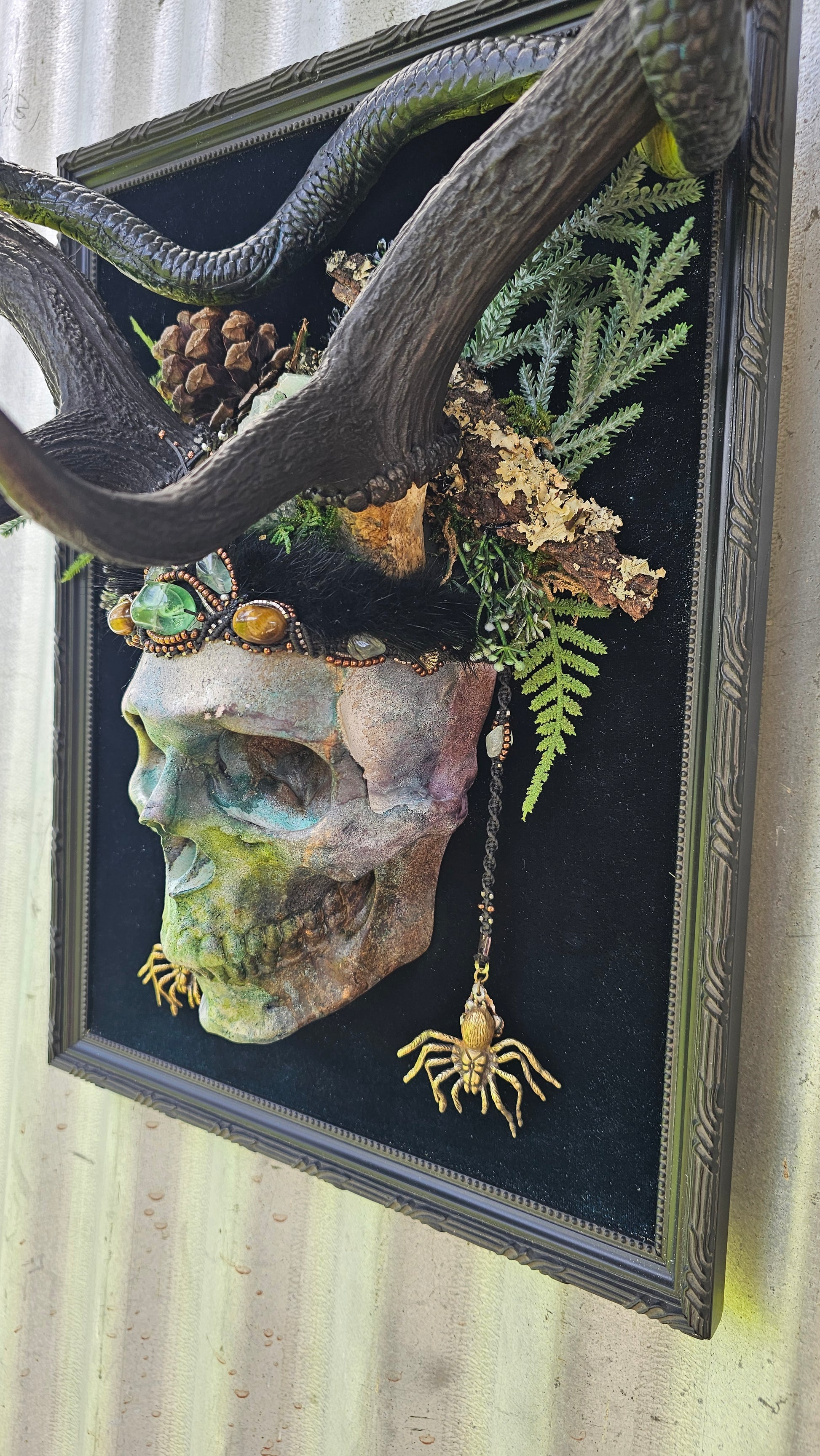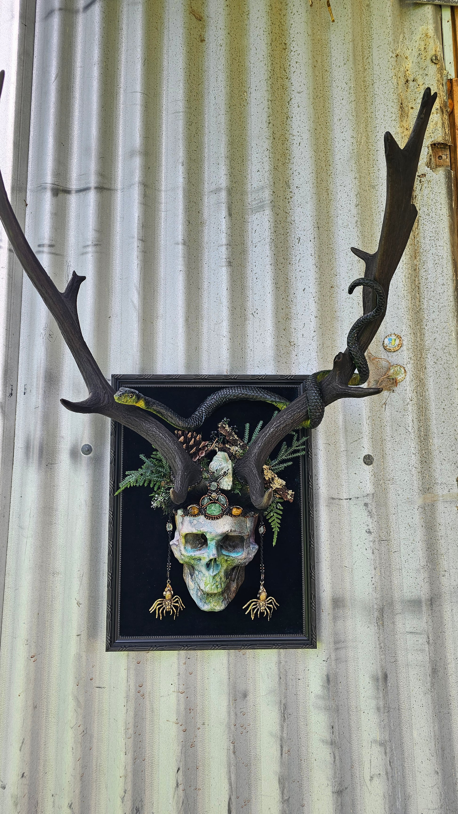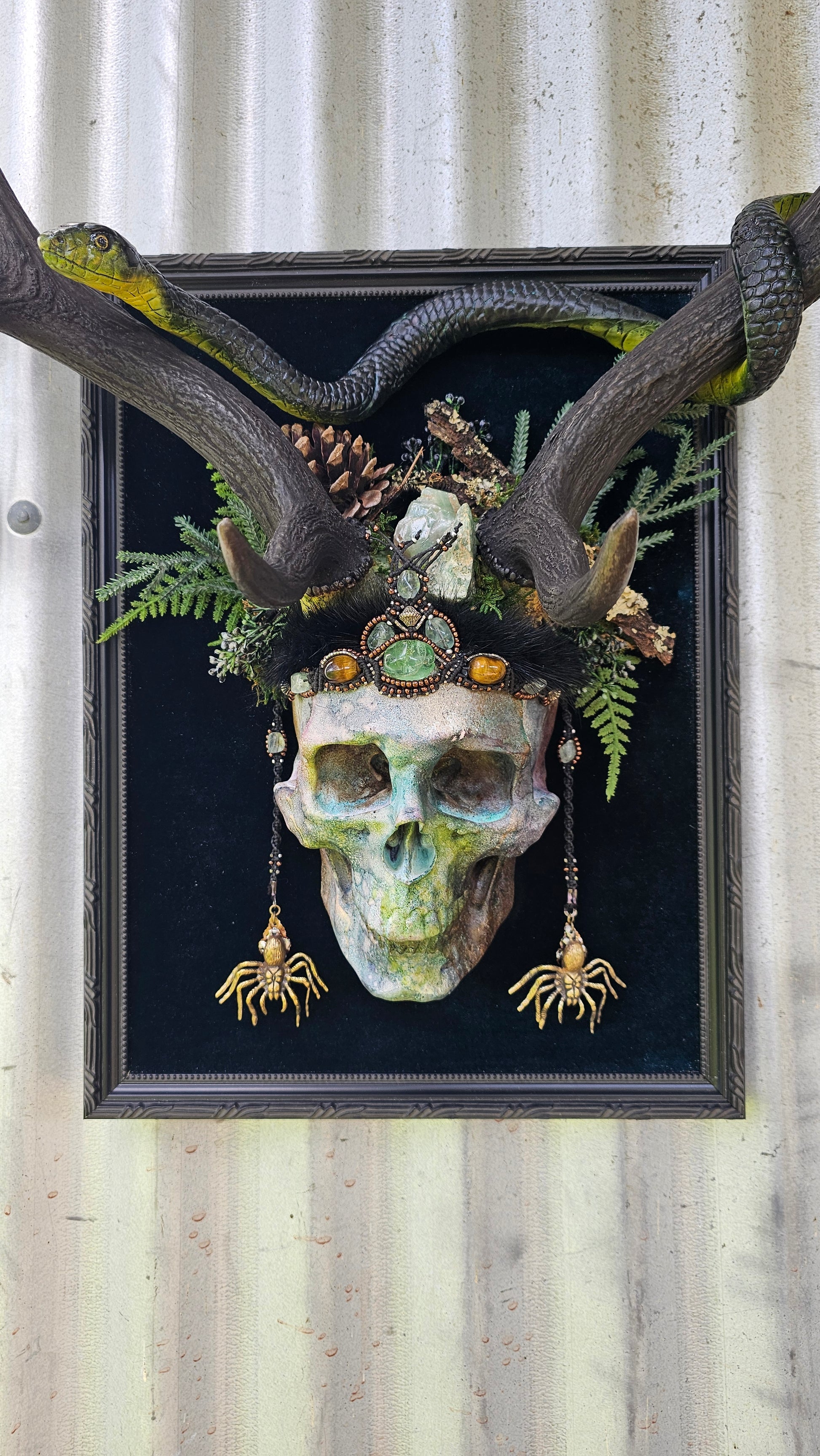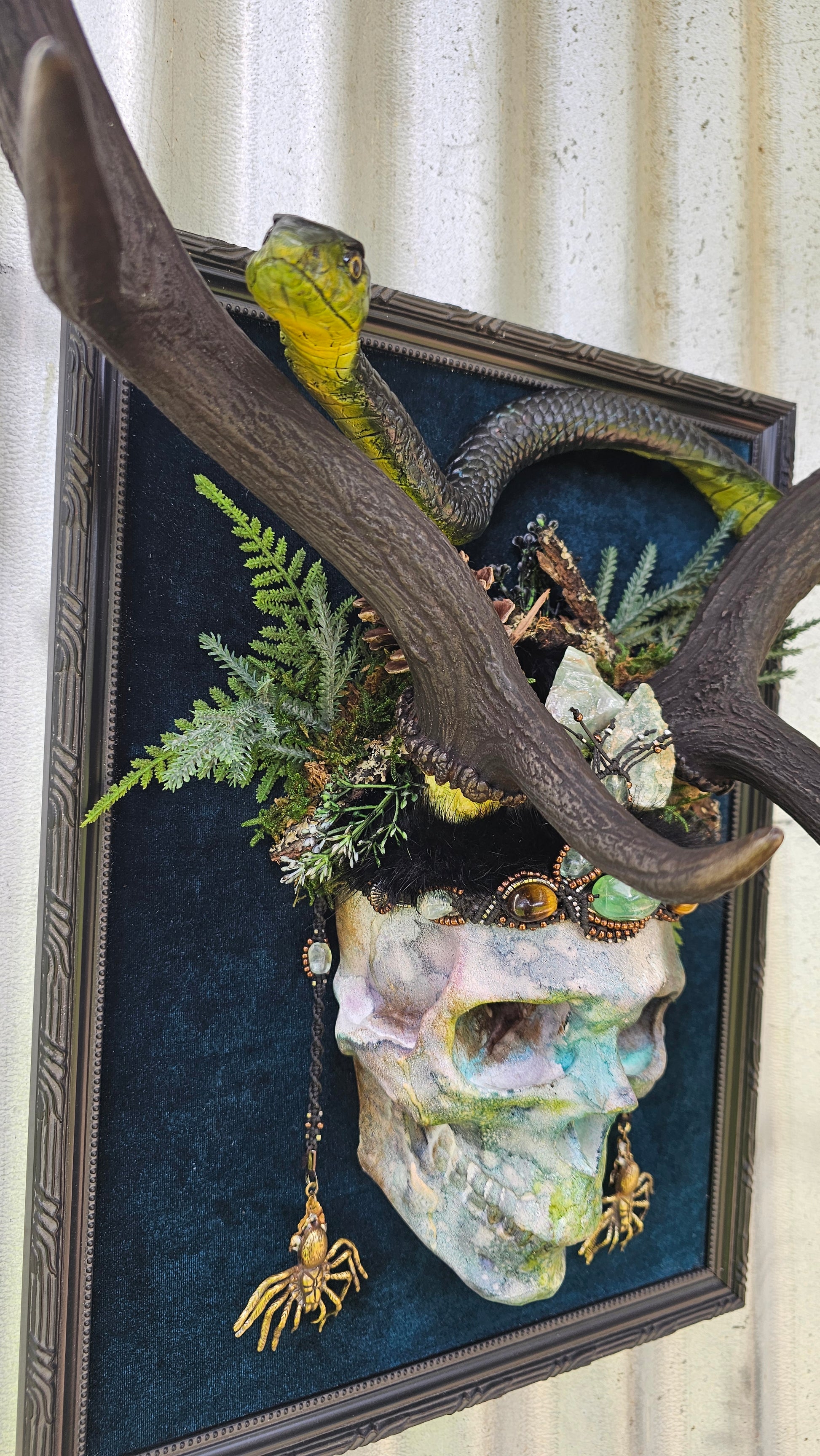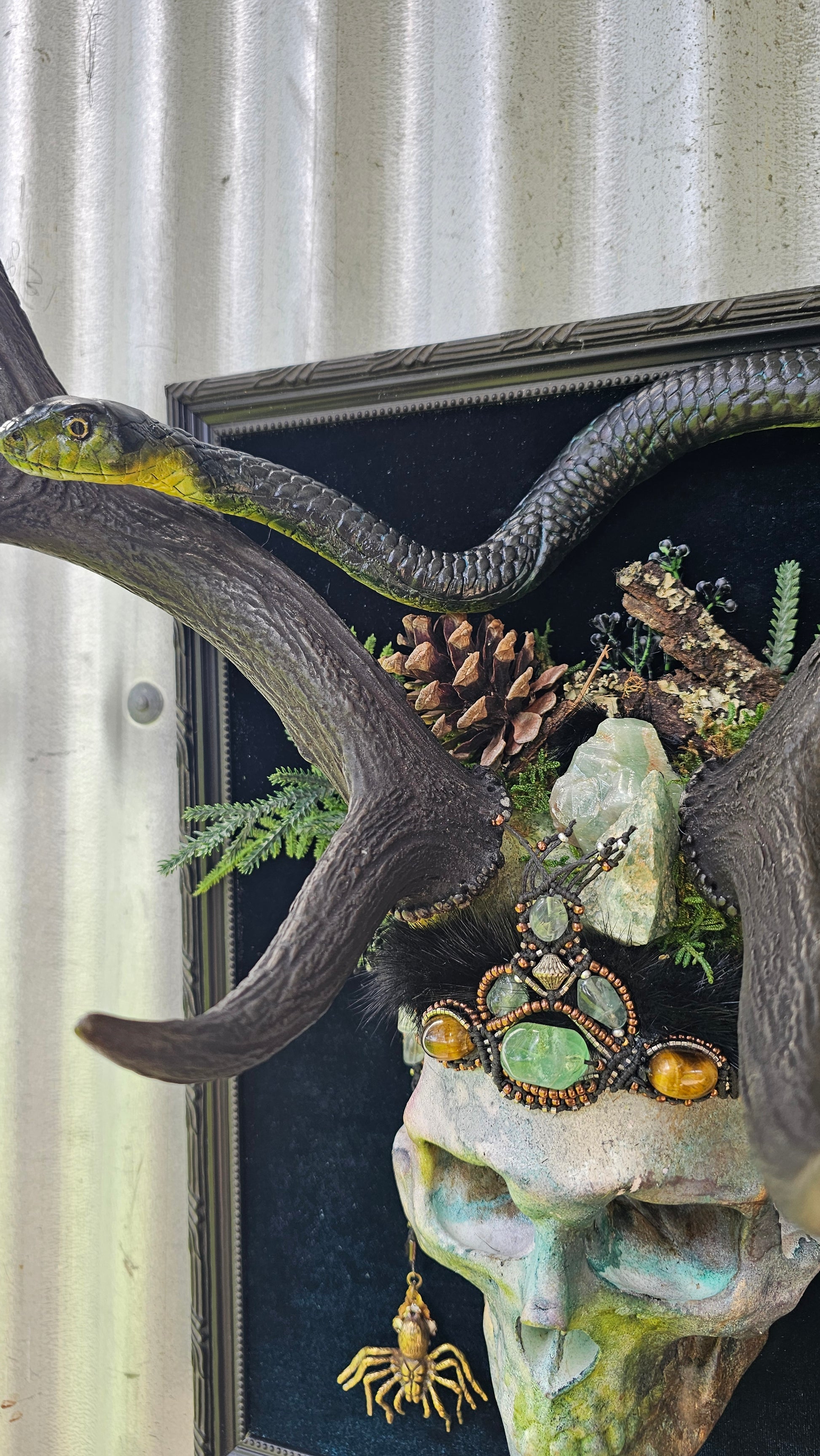Elevate your curiosities collection with our boldly crafted Fallow deer antler piece. This daring creation merges authentic fallow deer antlers with a human-sized resin skull and beautiful green tree snake intertwined throughout. The crown is adorned with real green gemstones and brass spider earrings dangle— perfect for those who dare to embrace the mystical and display their darker aesthetic sensibilities.