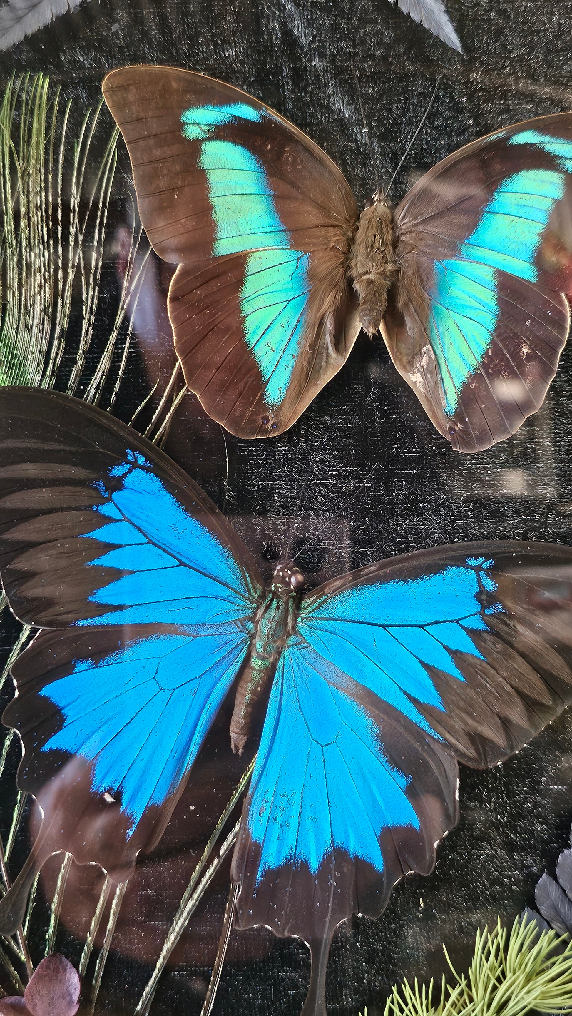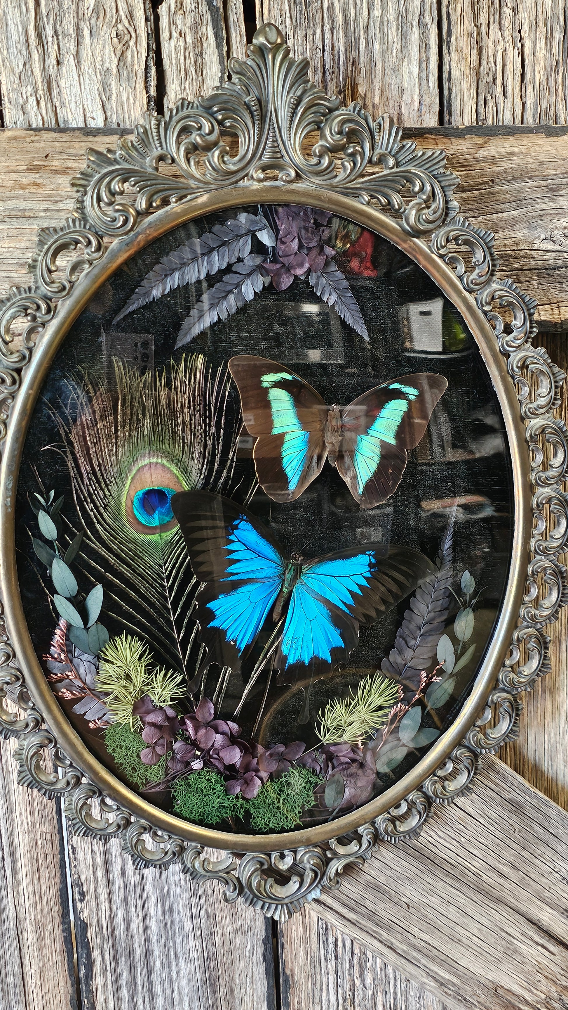 This vintage Italian brass frame showcases delicate blue Swallowtail butterflies accompanied by dried flowers, peacock feathers, and preserved moss. The Gothic-inspired bubble design offers a refined and subtle natural accent, enhancing the atmosphere of any room without overwhelming it. Each frame is carefully crafted to capture a unique moment of natural beauty, making it a distinctive piece that quietly enriches your home decor. Ideal for those who appreciate understated elegance and the timeless charm of nature preserved in art.
