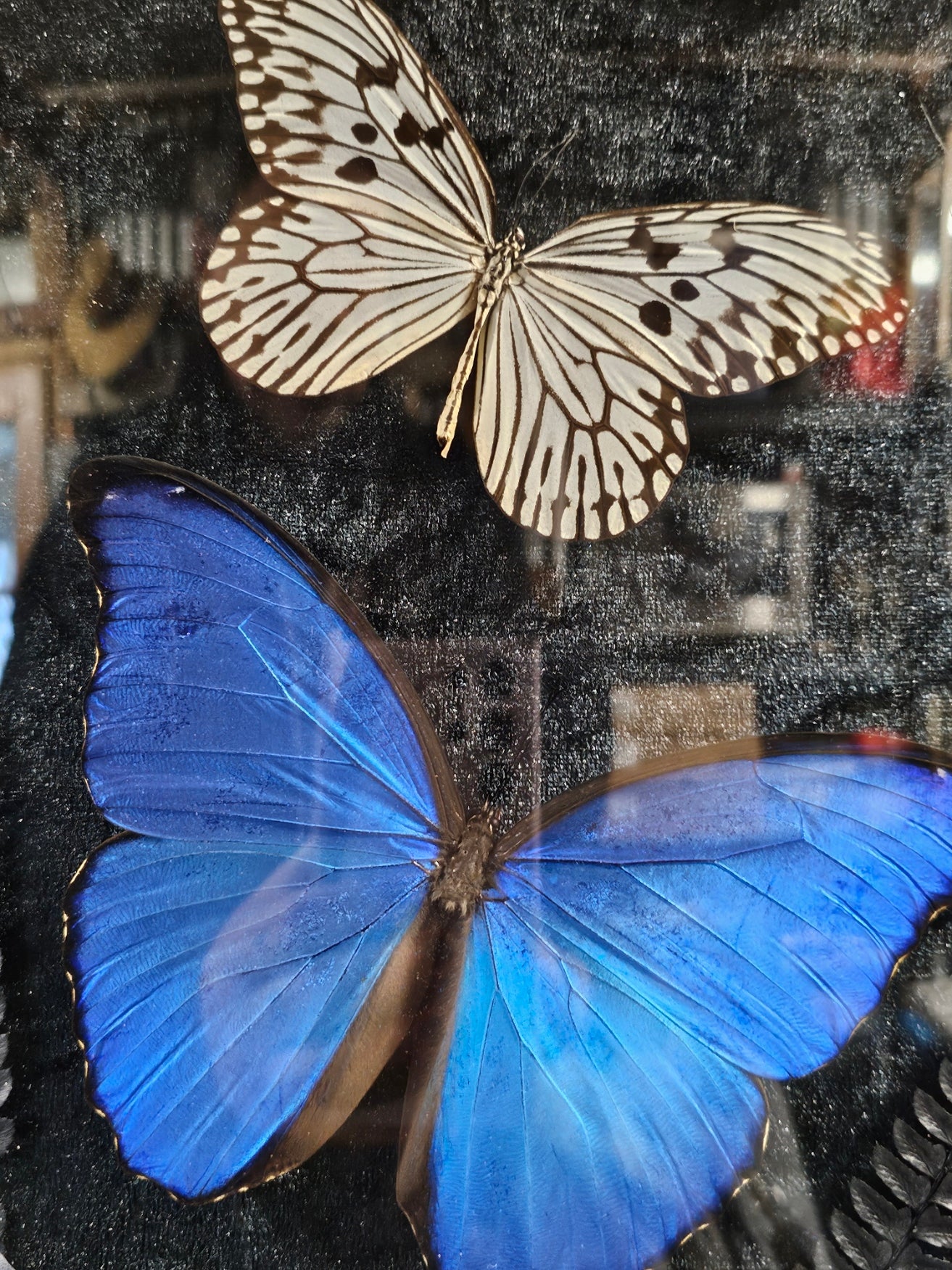 Enhance your gothic interior with a refined blend of elegance and dark allure through this vintage taxidermy artwork. The Victorian Gothic bubble frame elegantly presents an Giant Blue Morpho butterfly set against a sumptuous black velvet backdrop. Complemented by vintage convex glass, this distinctive piece is an essential addition for discerning art collectors and sophisticated interior design aficionados.