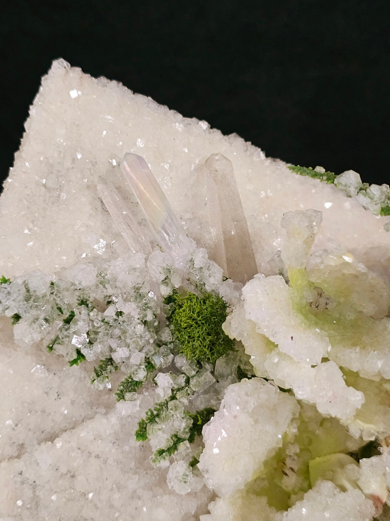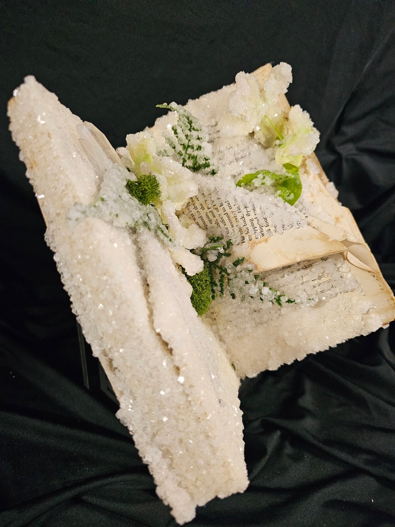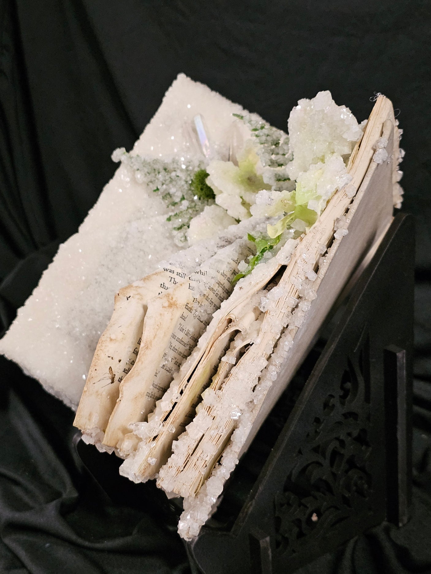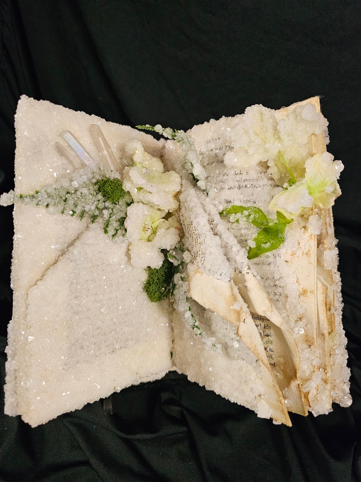 Crystalized book decorated with real quartz aura crystals and artificial leaves.