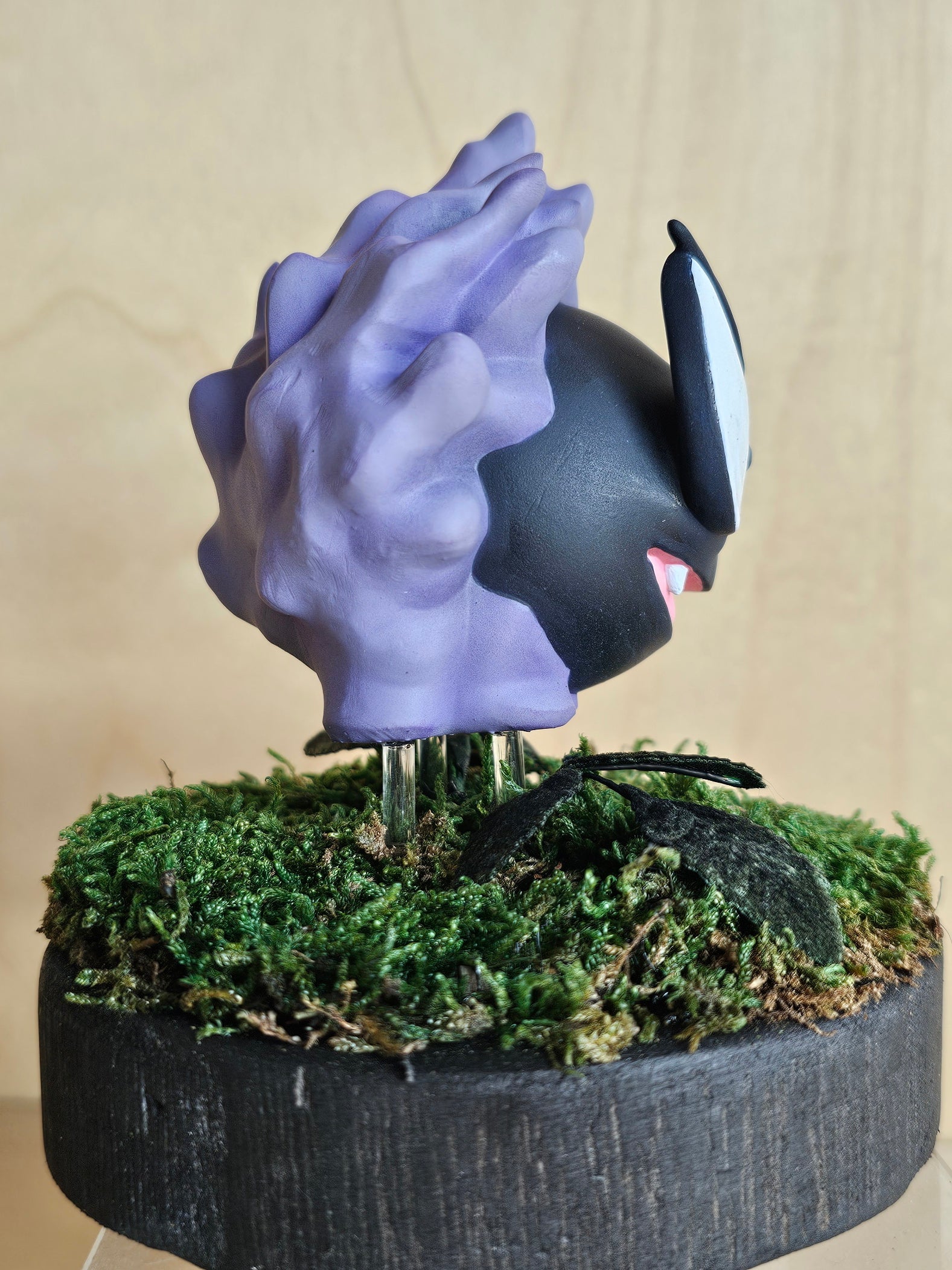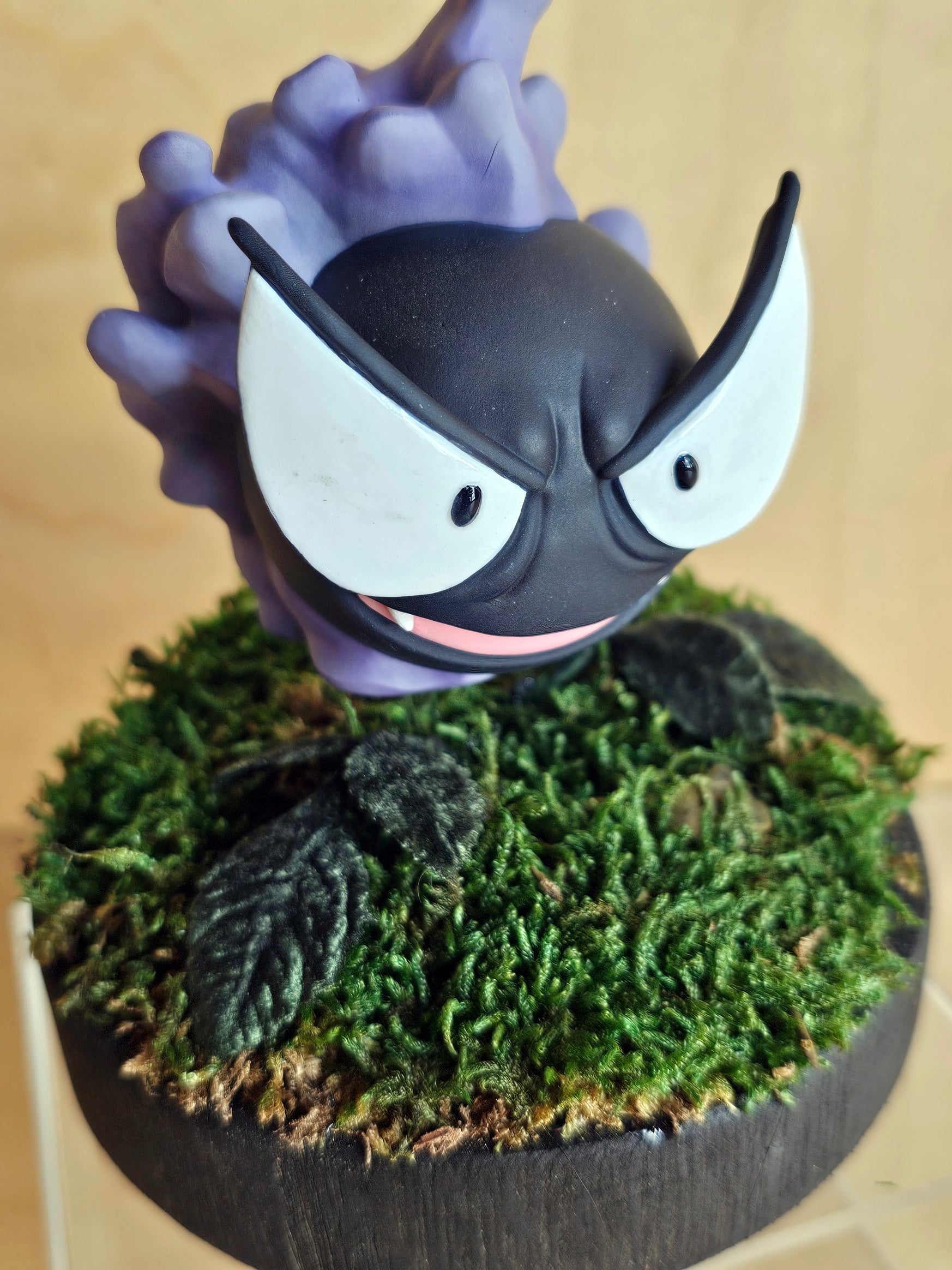 Gastly is mounted on a blackened timber base covered, floating above real preserved moss and dark leafy greens.