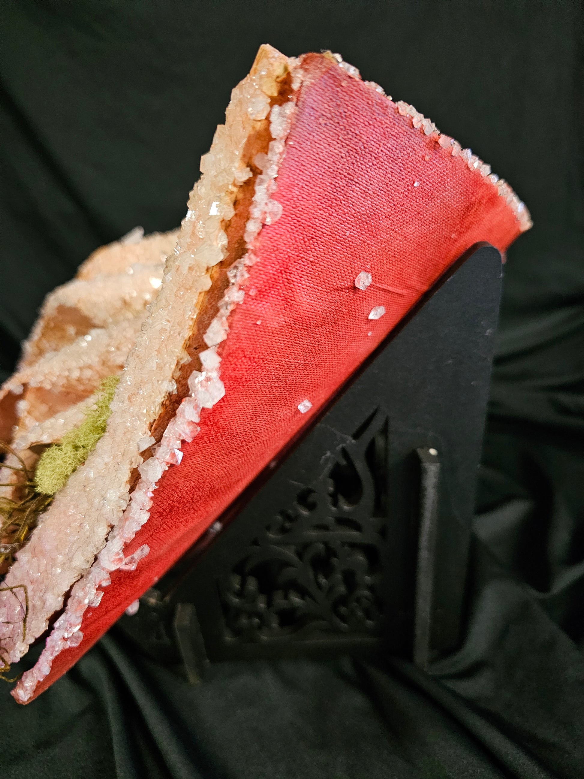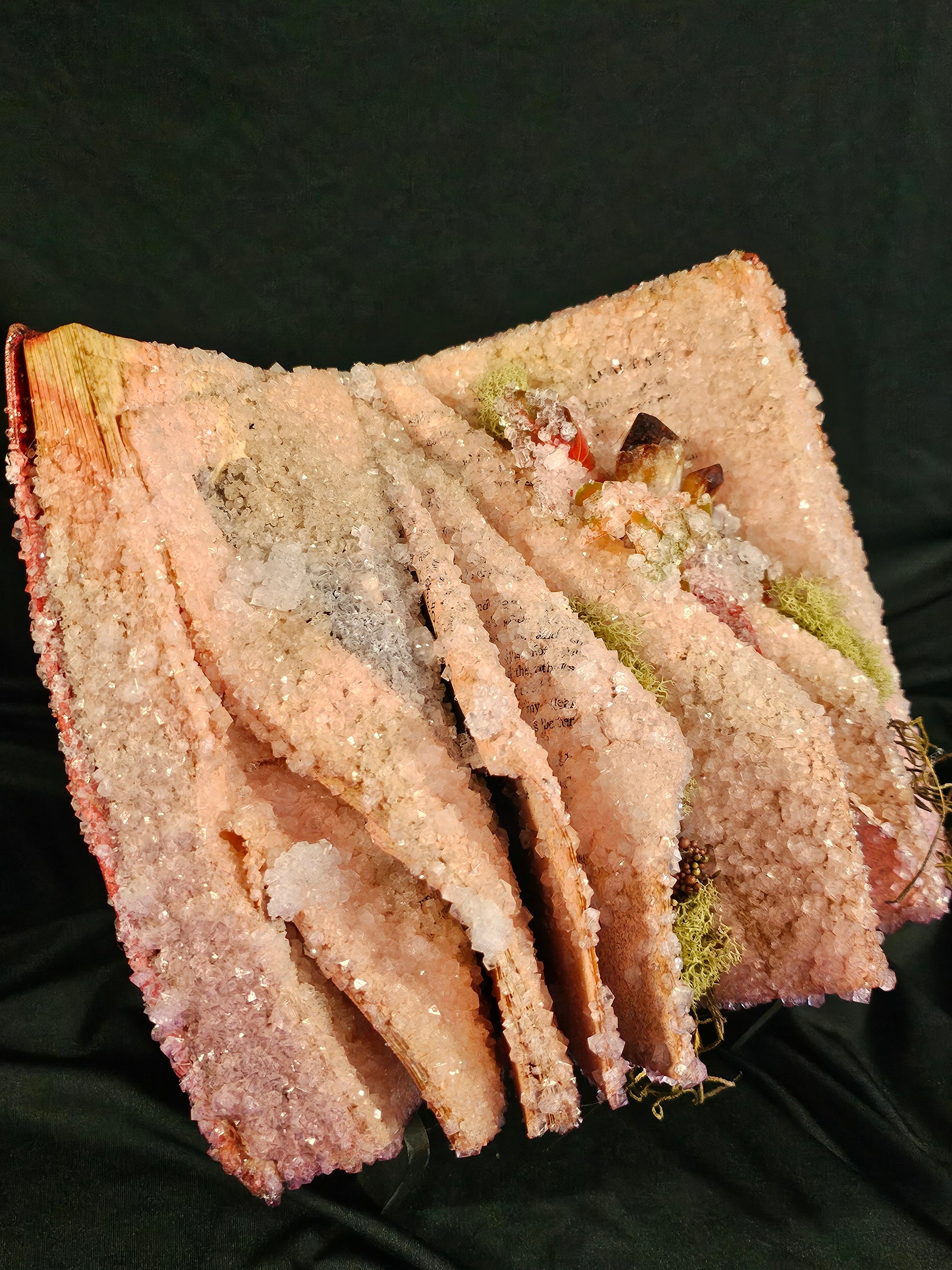 Each book comes with a black engraved book stand so you can showcase your new addition and an information card. The crystals are home grown with household safe materials and they are well sealed with many layers of UV Archival varnish.