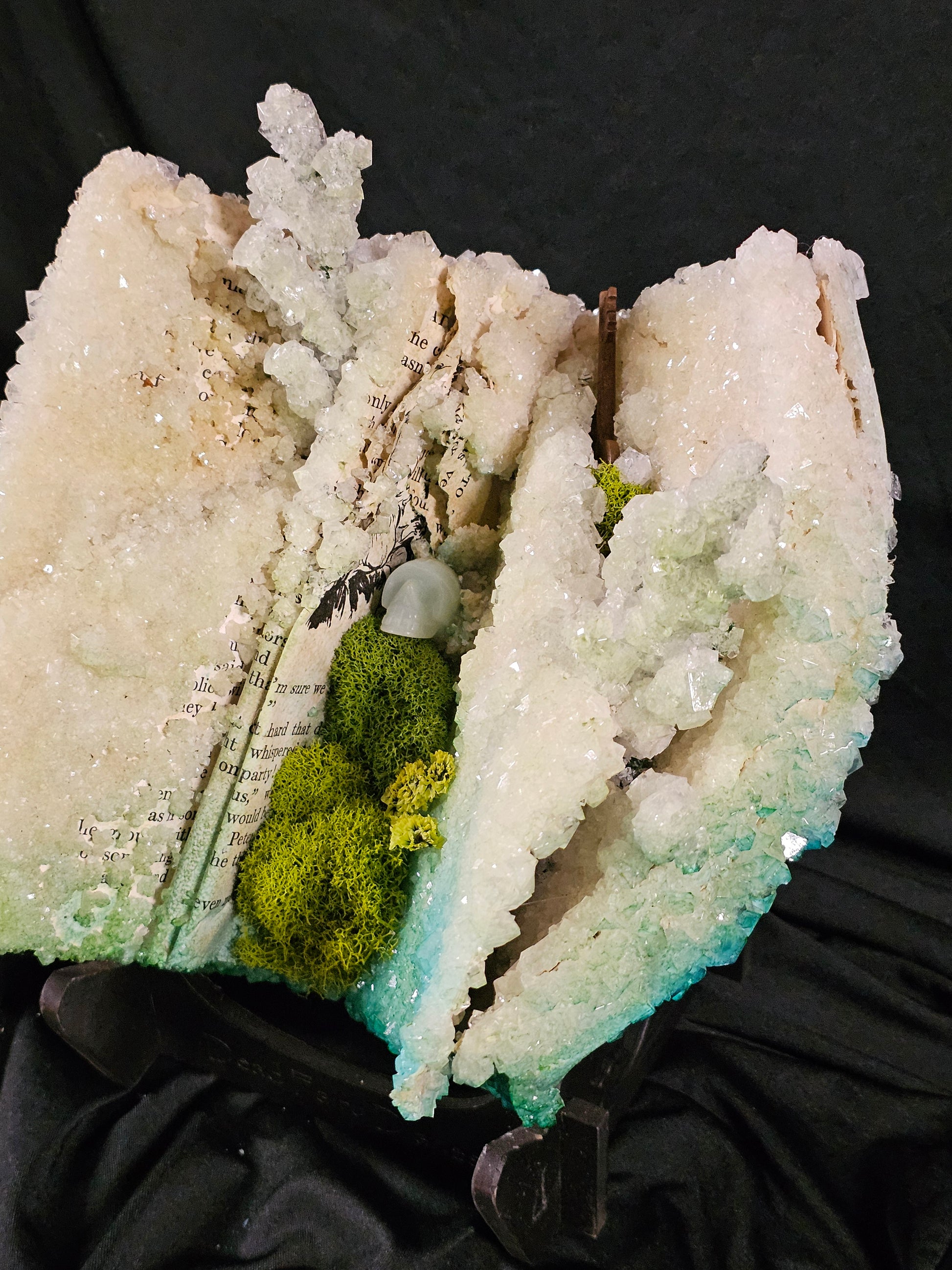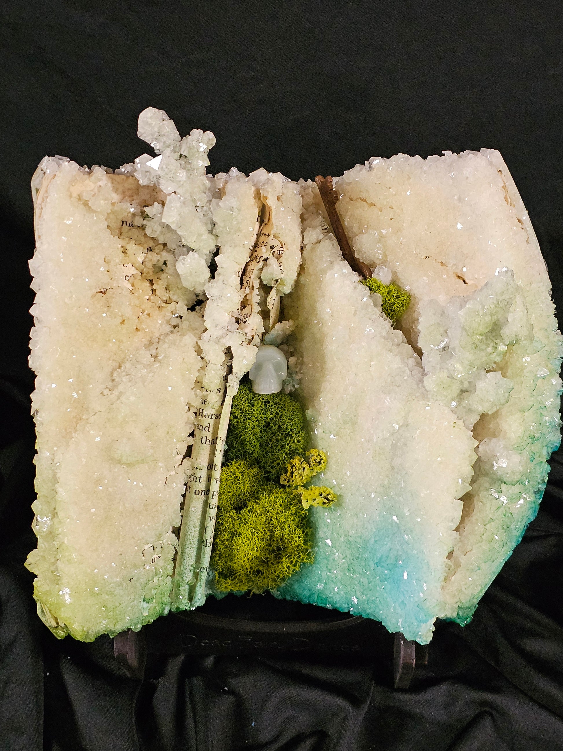 Crystalized book decorated with real crystal gemstone skull, preserved moss and artificial flowers.