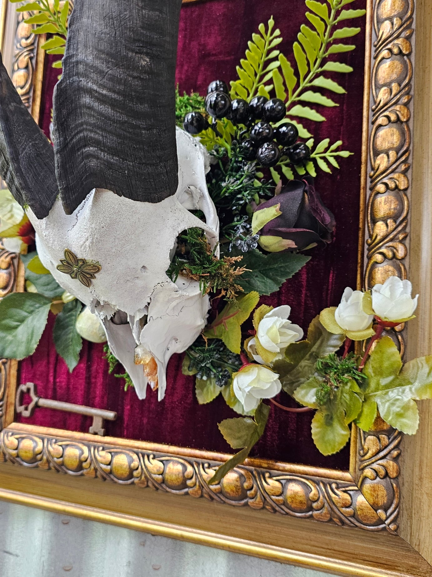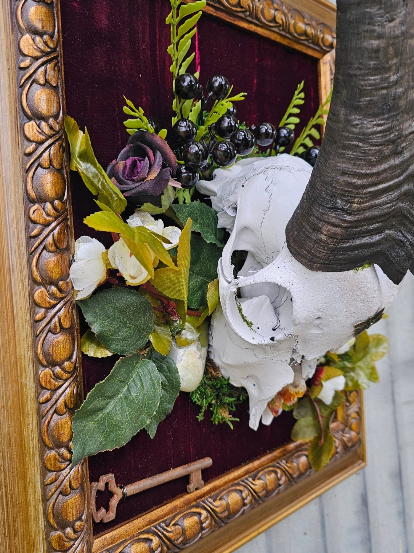Defy convention with this audacious gothic statement piece. An authentic goat skull reigns supreme within its gold antique-style frame, its stark white and black form creating electric contrast against a backdrop of blood-red velvet. Surrounding this morbid centerpiece, a defiant collection of artificial roses and berries mingles with gleaming gemstones, while a time-worn rusty key and genuine preserved moss complete this boundary-pushing tableau designed to provoke and enthrall.