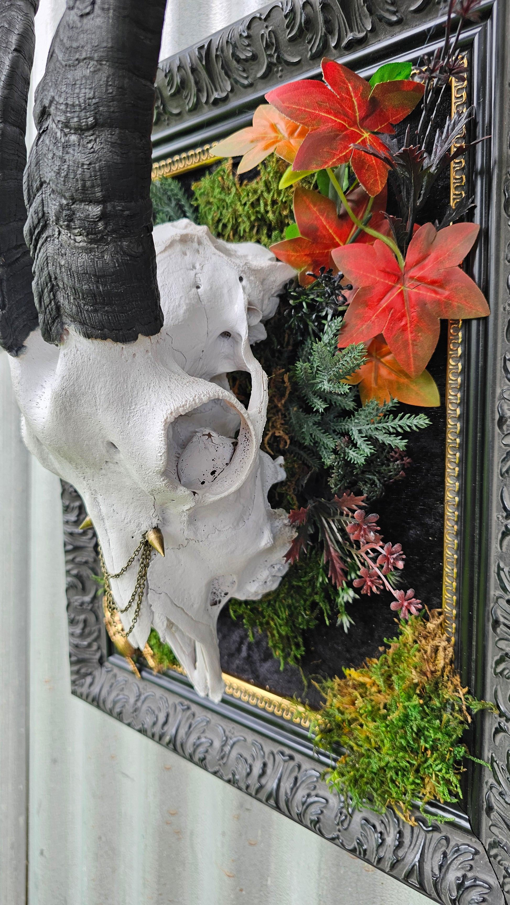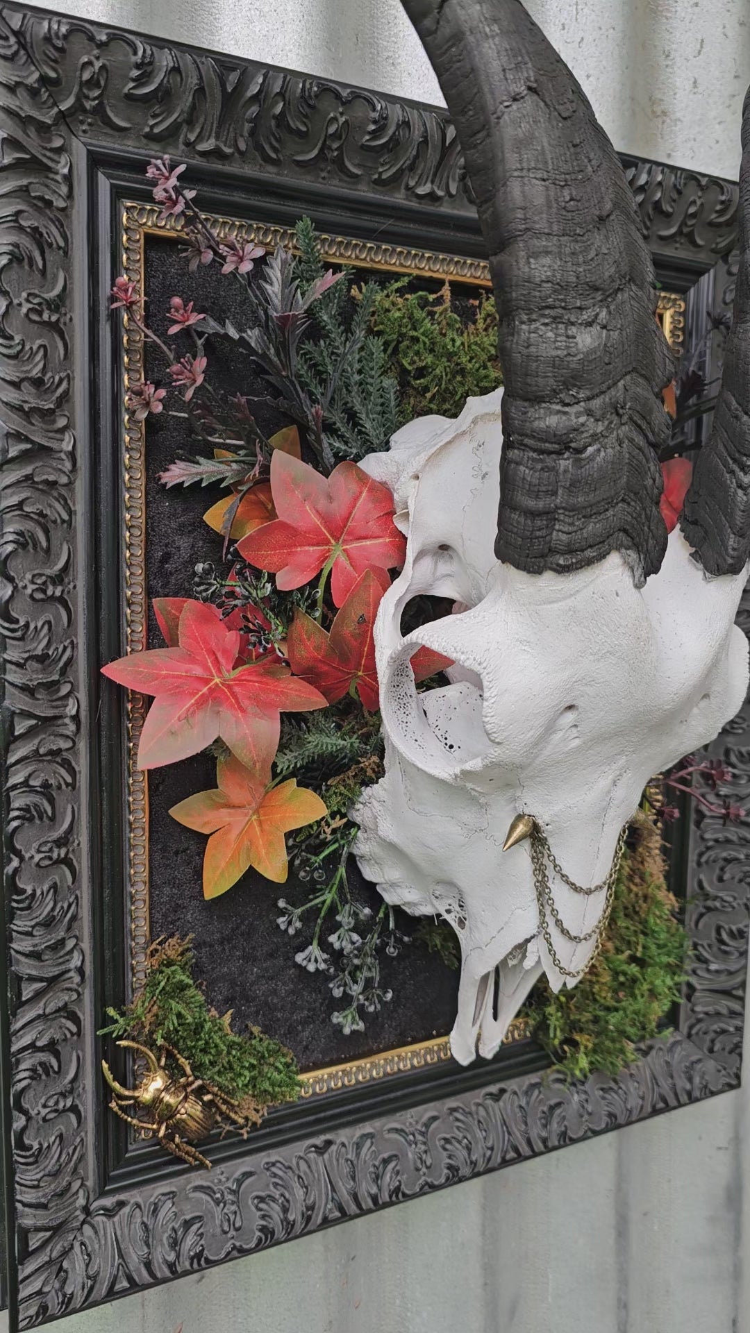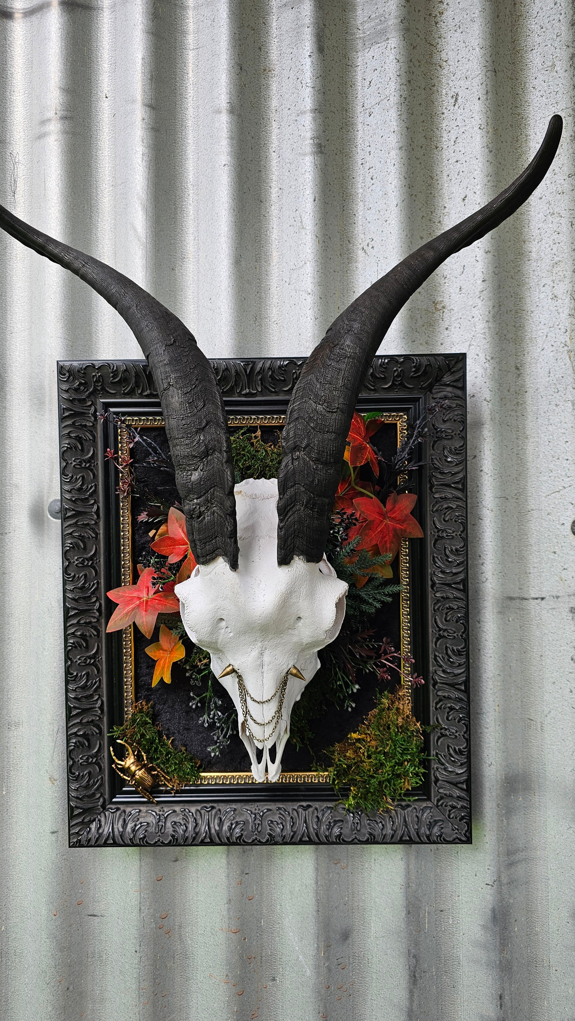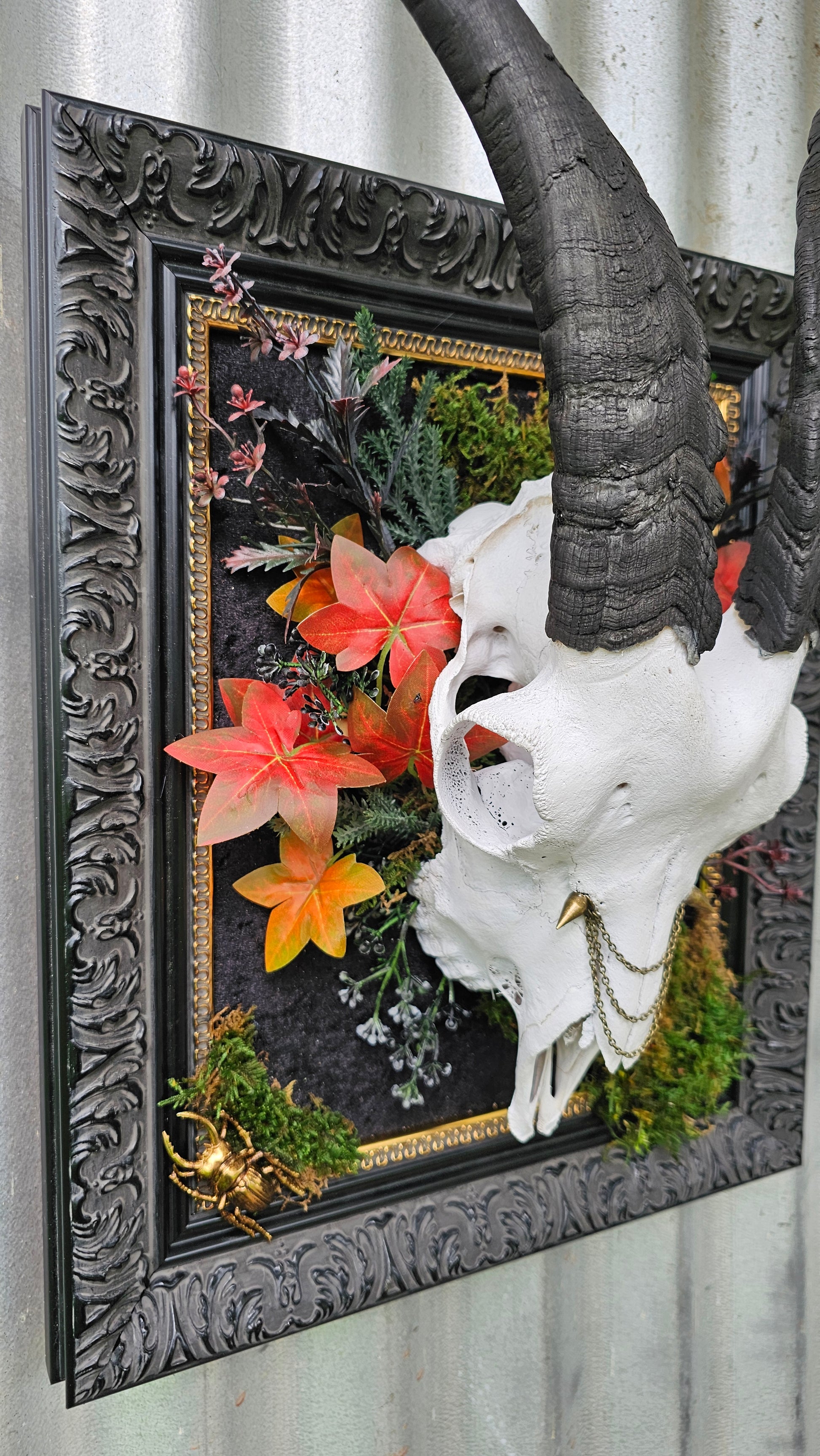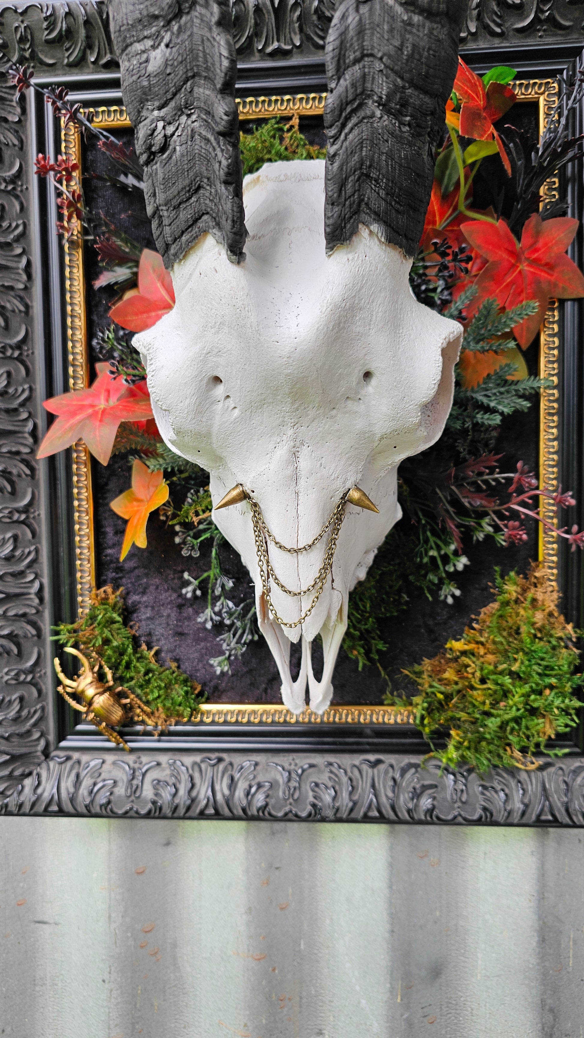 Create a powerful gothic statement with this exceptional piece. It showcases an authentic goat skull set inside a black and gold vintage-style frame, where the stark white skull contrasts vividly against a black velvet backdrop. Surrounding the skull is a curated mix inspired by an autumn forest, featuring a brass beetle, chain accents, and genuine preserved moss.