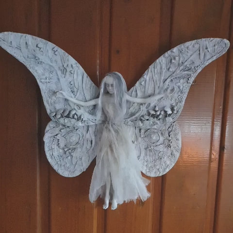 I hope you enjoy this unique Dead Fairy sculpture. She is an entirely one-of-a-kind creature, never to be repeated, all hand made and sculpted over a strong wire armature designed to hang on your wall. Emoria is made using paper clay and mulberry paper, her hair is from mulberry silk and merino fibers, her dress in mulberry paper and silk gauze.