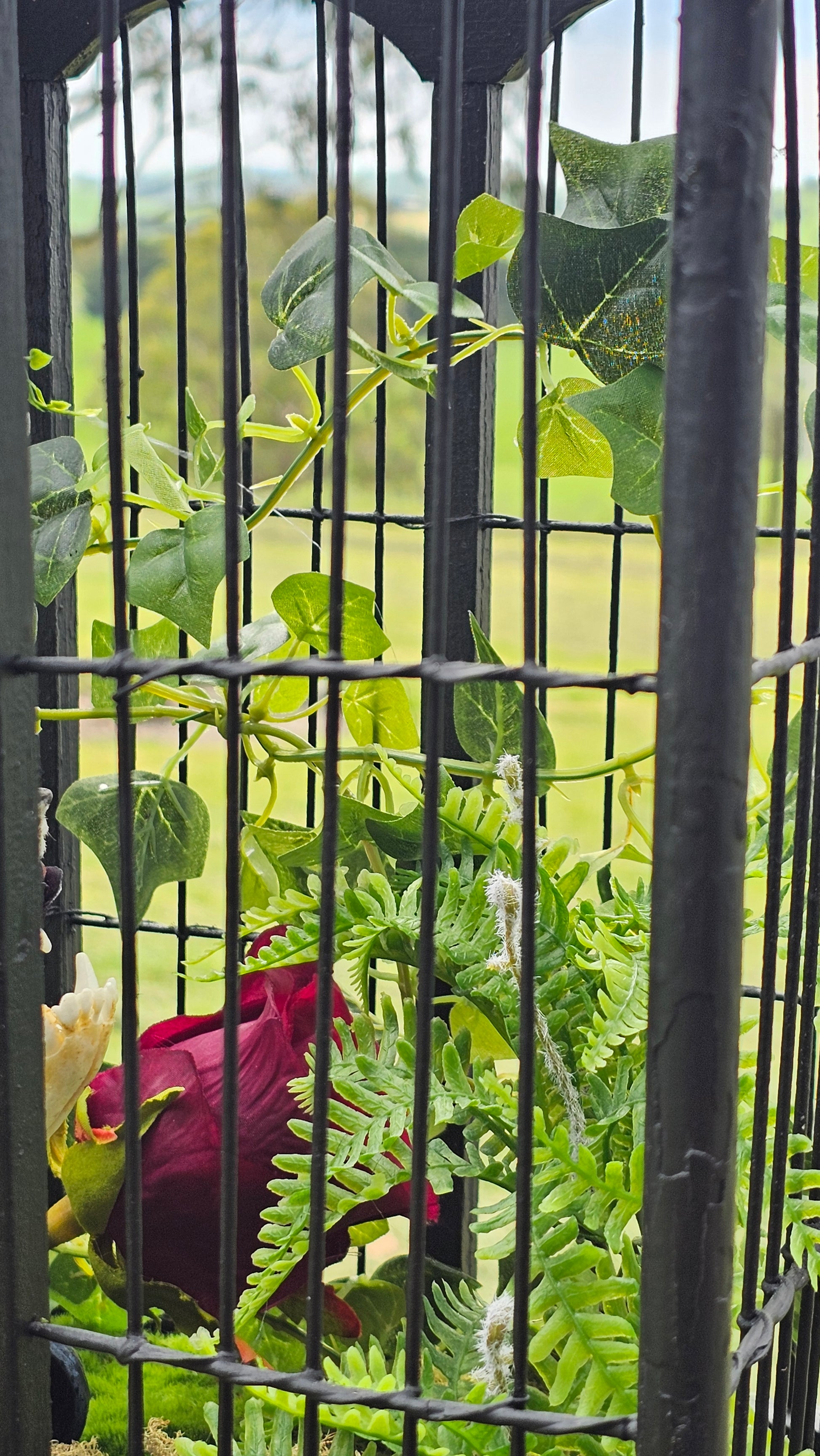 This statement black birdcage exudes Victorian gothic charm and houses a striking combination of taxidermy Budgerigar and fox fur with skull. Adorned with silk and plastic florals, preserved moss and lichen, this piece is a unique addition to any dark aesthetic collection.