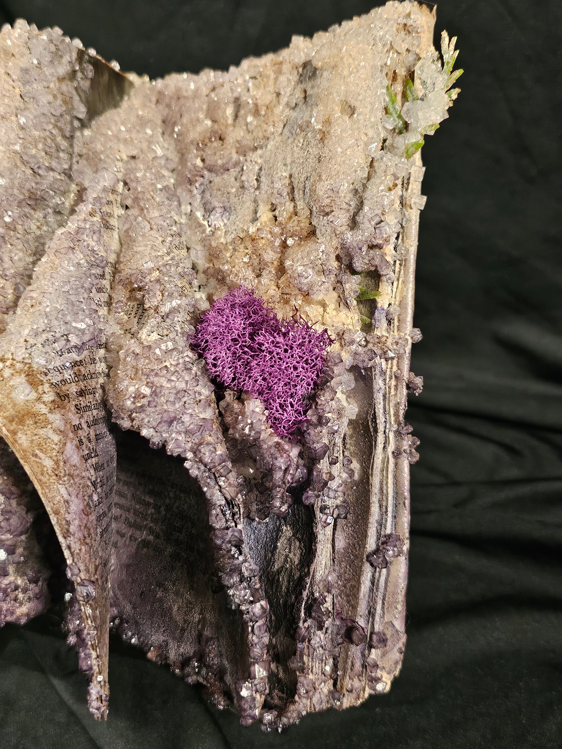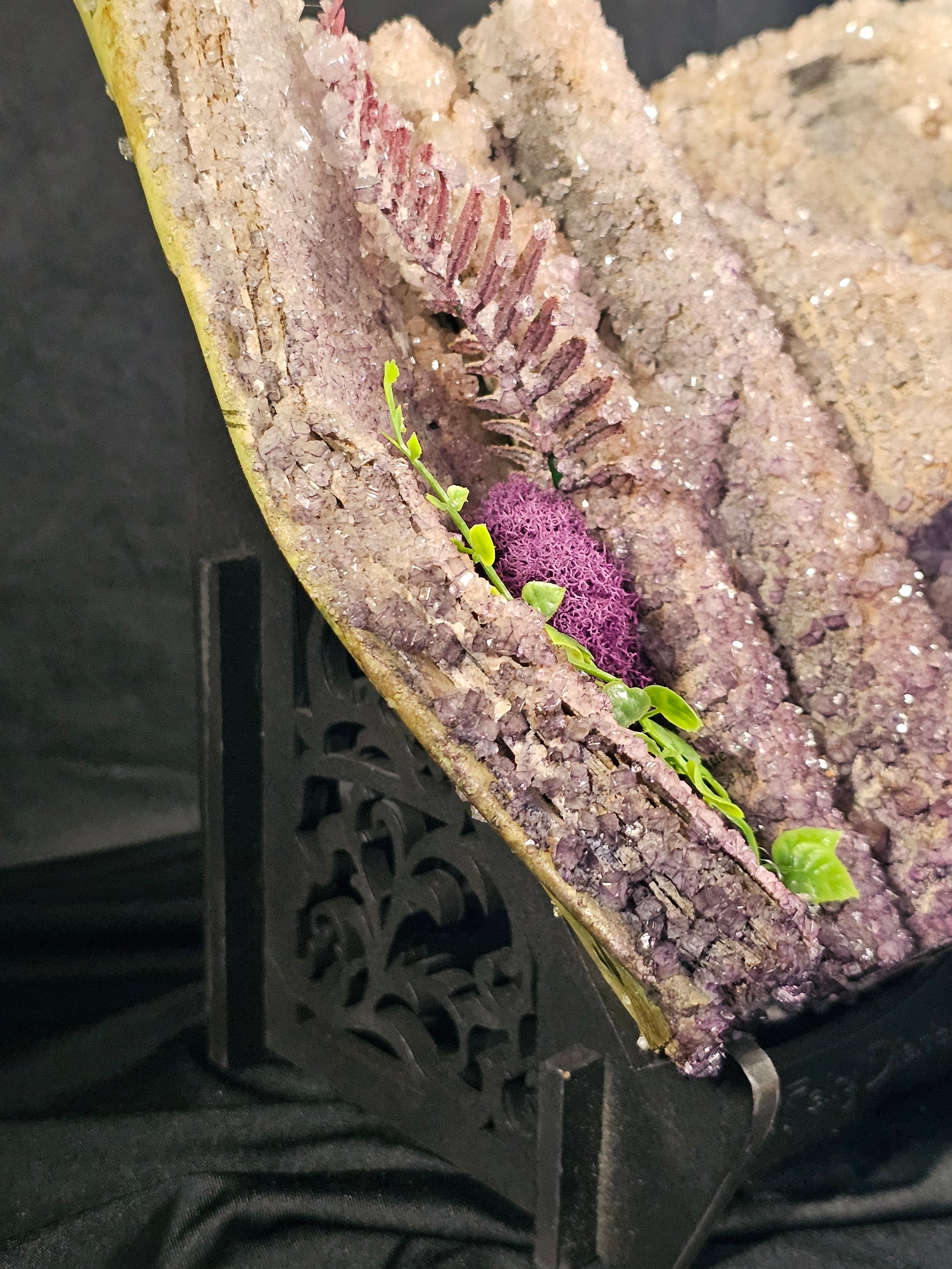 Crystalized book decorated with real preserved moss and artificial leaves.