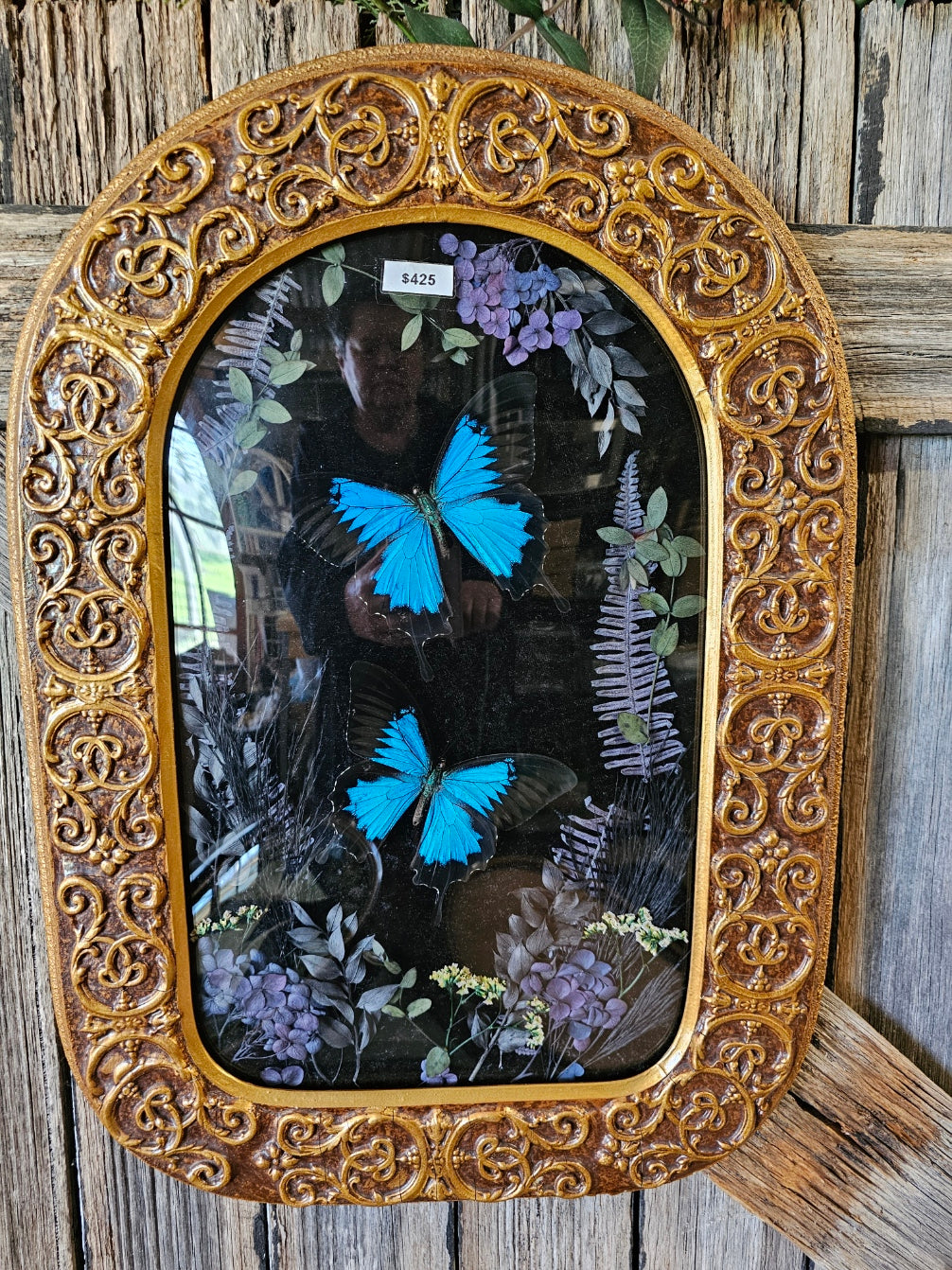 Elevate your interior aesthetic with this exquisite Victorian Gothic bubble frame featuring a pair of magnificent Blue Mountain Swallowtails. The sophisticated interplay of black and blue creates an irresistible visual harmony. Meticulously mounted within an authentic 1920s ornate vintage frame and artfully complemented by dark dried florals, this piece serves as a distinguished focal point for discerning collectors.