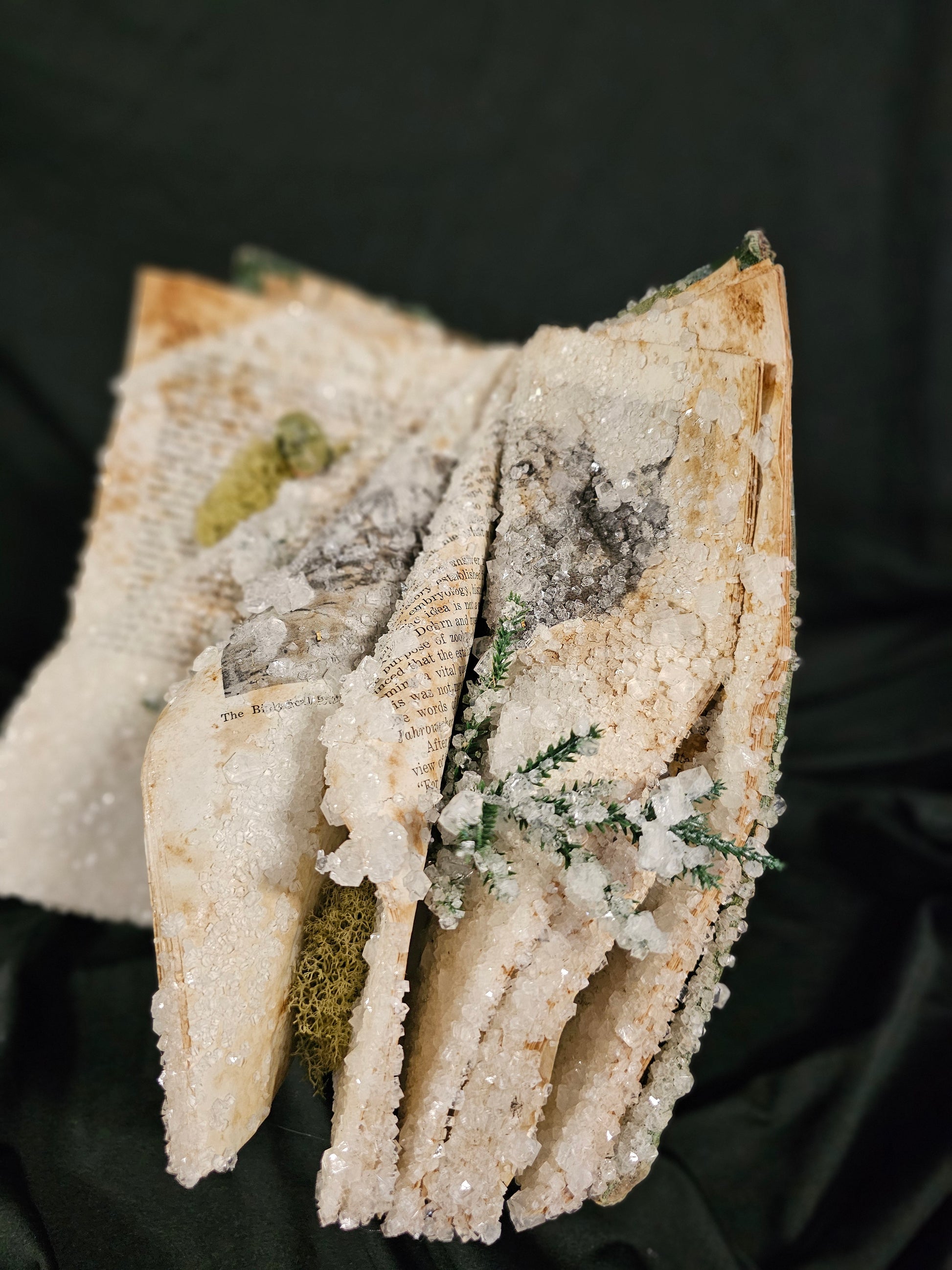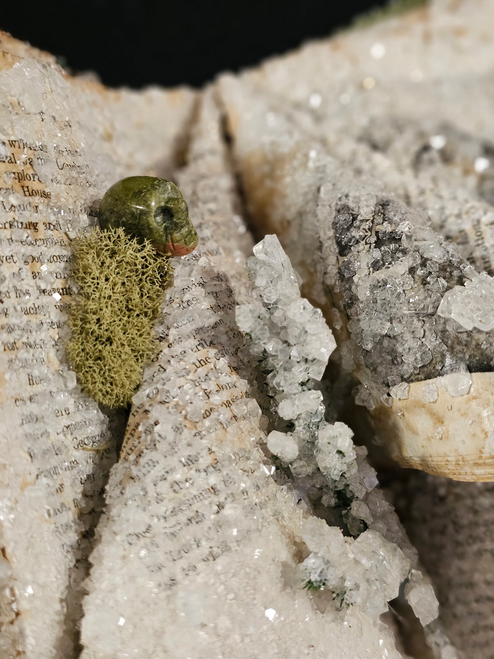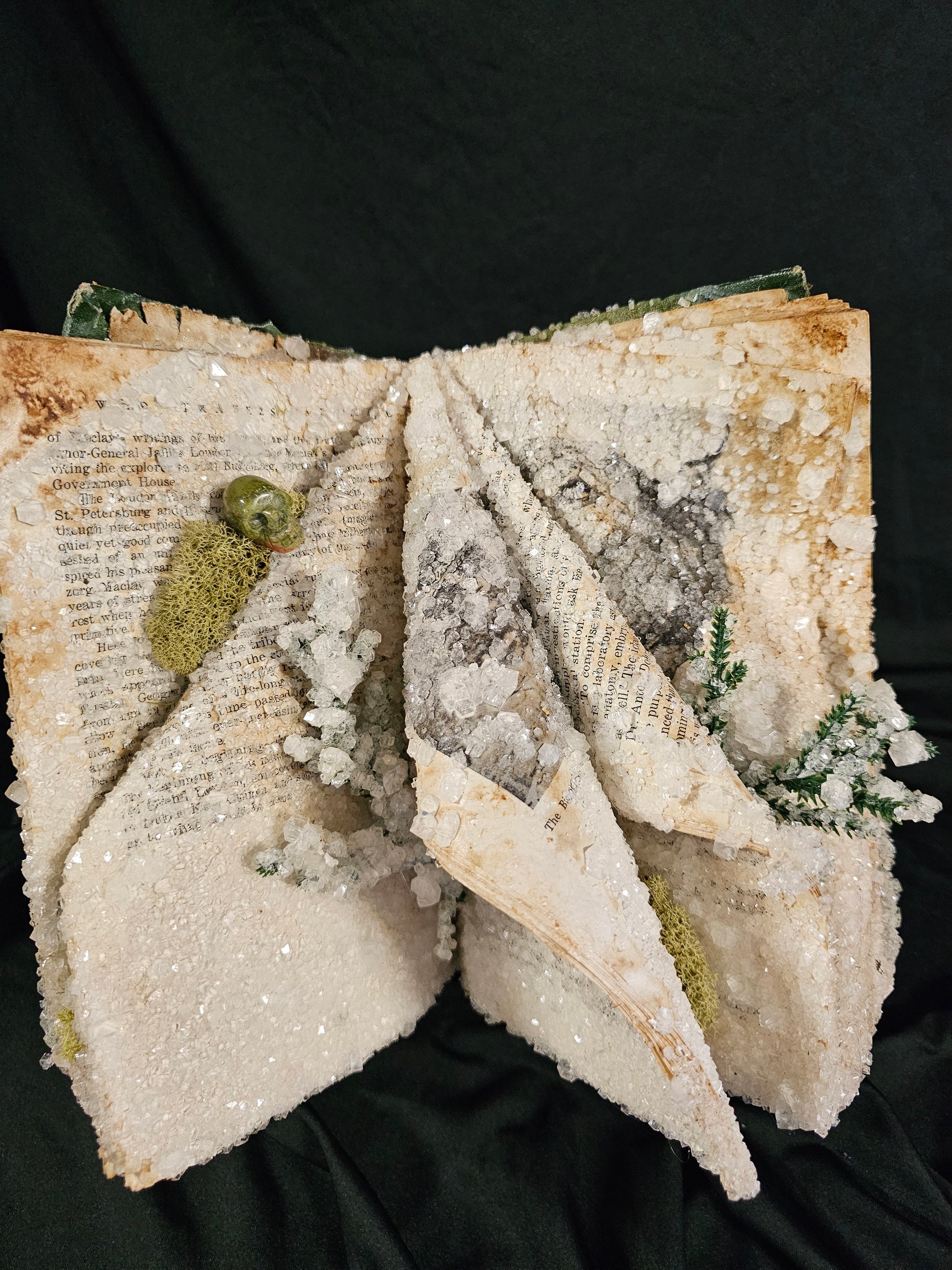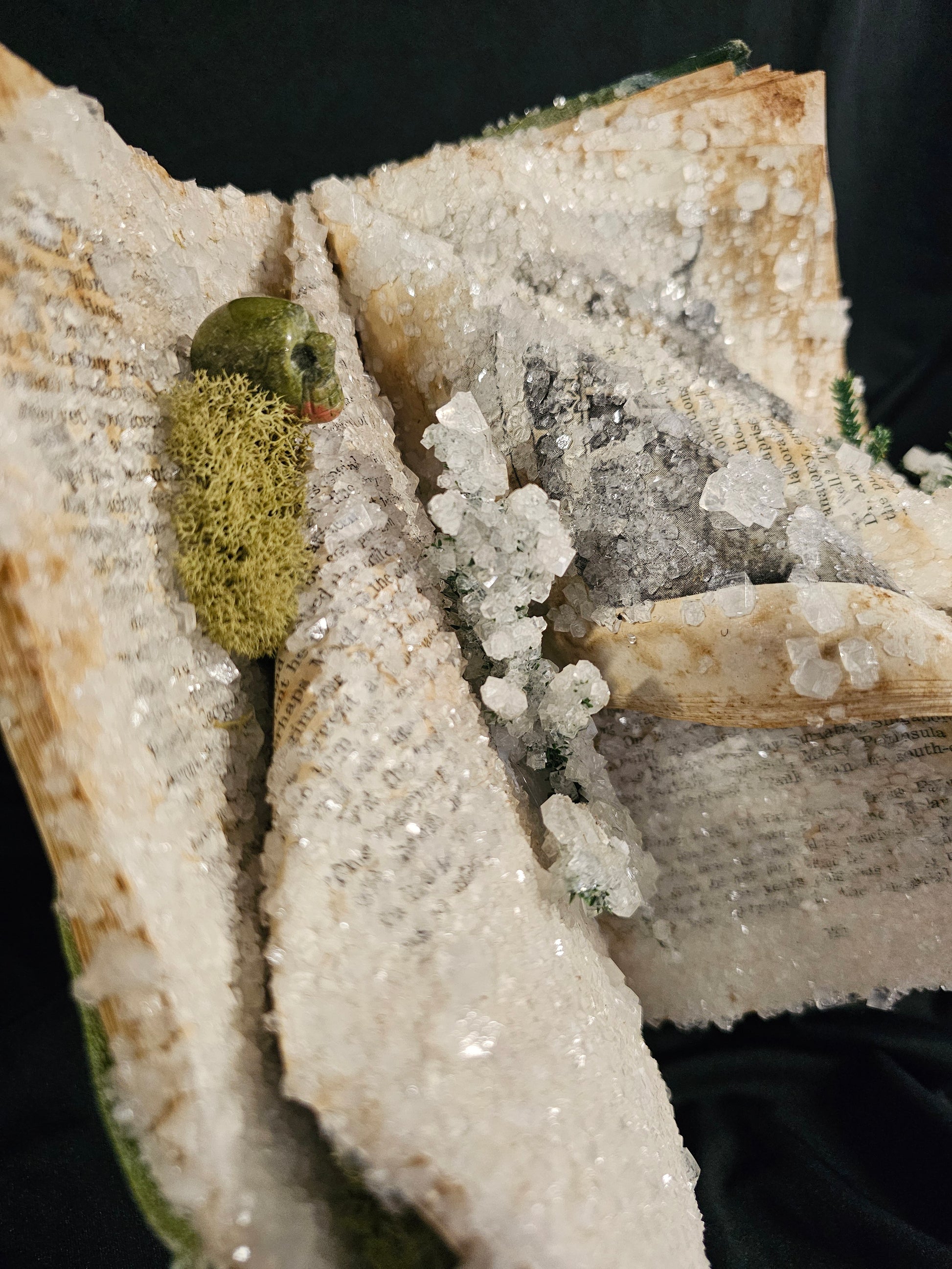 Crystalized book decorated real gemstone skull, preserved moss and artificial leaves.